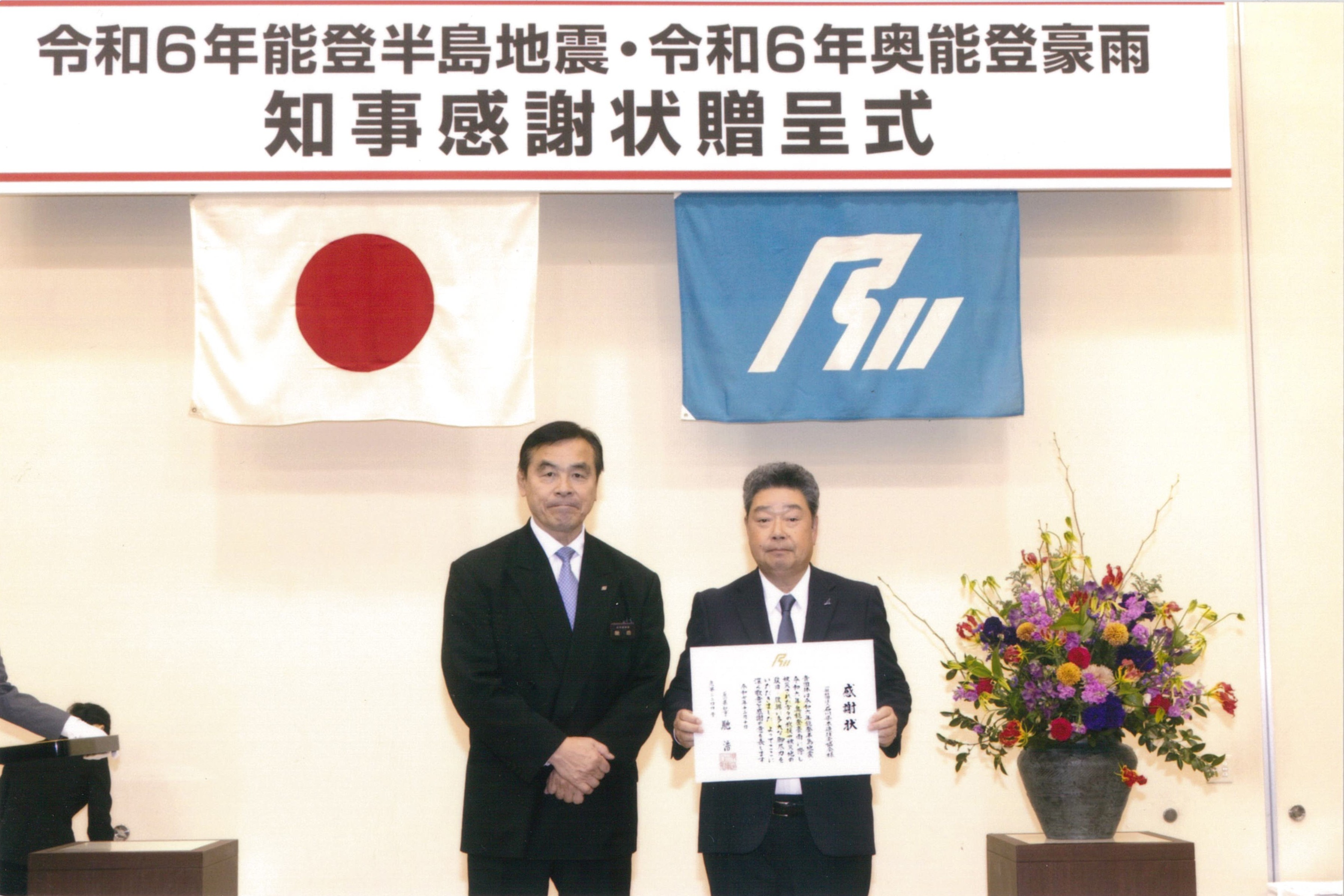 山田会長が「令和6年能登半島地震・令和6年奥能登豪雨 知事感謝状贈呈式」に出席し、馳知事から感謝状が贈呈されました。